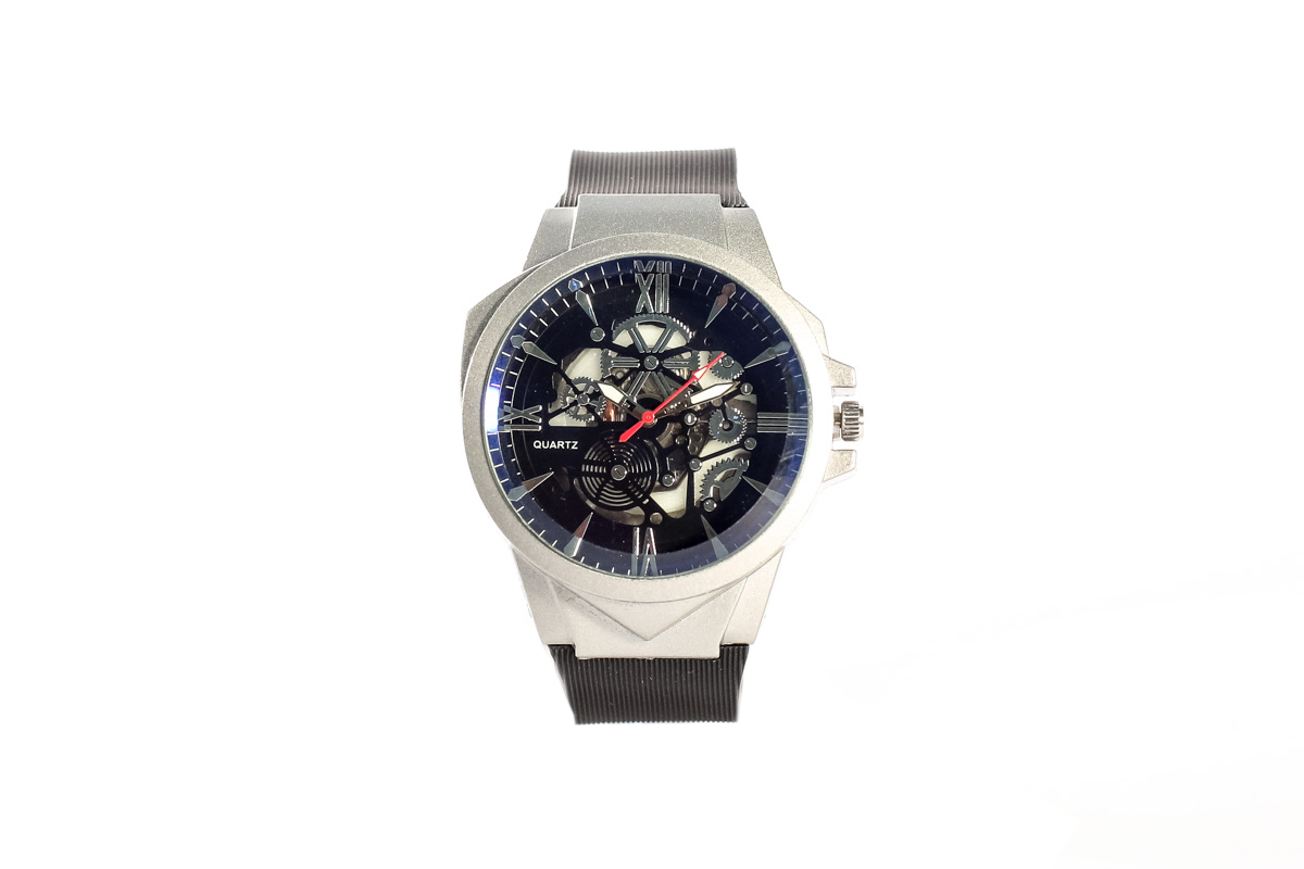 • Циферблат: Стилен в черно със сребърни акценти и оригинален скелетон дизайн, който придава динамика и дълбочина. Маркерите и стрелките са ясно видими, с контрастен блясък за по-лесно разчитан с подсветка